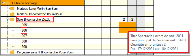 2/ Le matériel est alors listé par numéro de série. Les cases colorées signifient que le matériel est réservé. Survolez avec le curseur de votre souris une case colorée : une bulle d'aide apparaît et vous renseigne sur le détail de cette réservation (Titre du Spectacle/Activité ; Lieu principal de l'évènement ; Quantité empruntée ; Date d'emprunt)