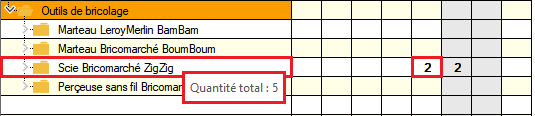 1/ Survolez avec le curseur de votre souris la ligne mère portant le nom du matériel : une bulle d'aide indique la quantité totale de ce matériel dans votre structure.