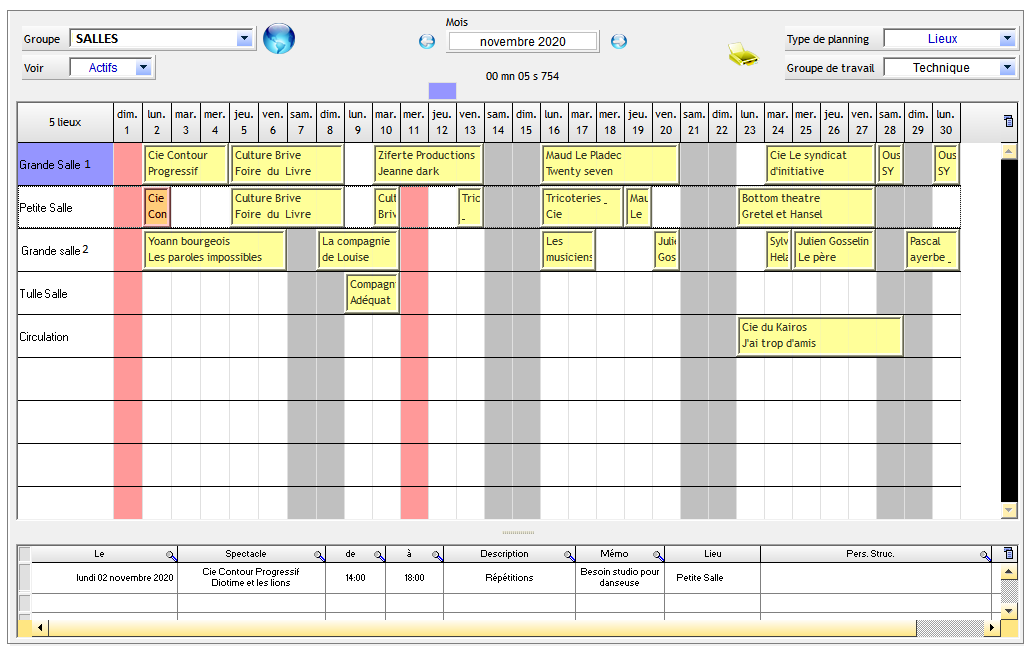 Pour afficher le détail quotidien, cliquez sur une case du planning mensuel à l'intersection d'une ligne (personne, spectacle ou lieu) et d'une colonne (date). La table du bas affiche alors le détail quotidien. Pour modifier une ligne de planning, double-cliquez sur cette ligne.