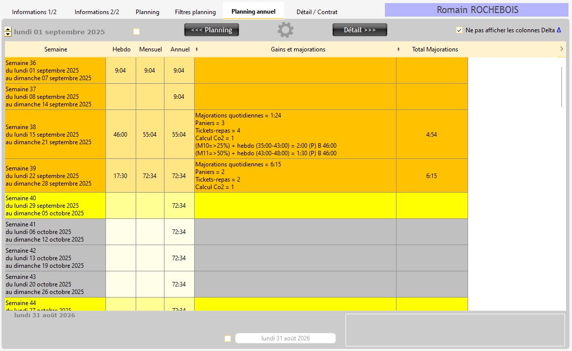 Pour la validation des heures, la modification manuelle des Gains & Majorations, la mémoire rapide et la simulation de planning, voir le chapitre "Présentation Planning annuel (permanent)".