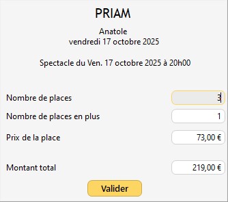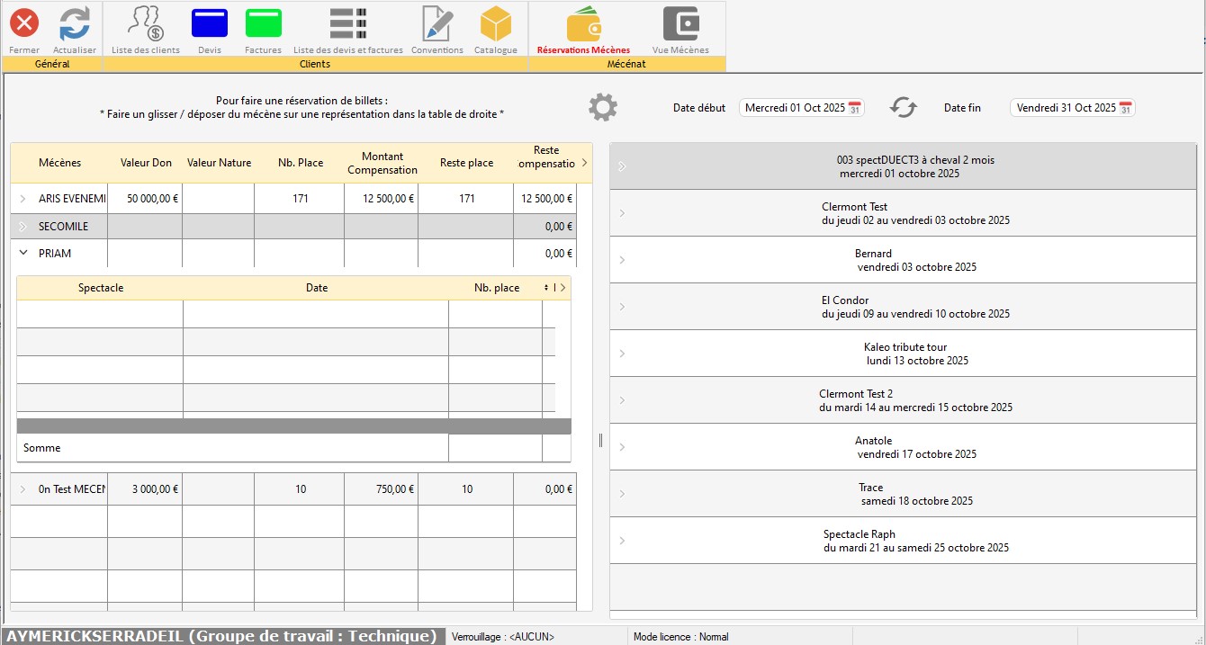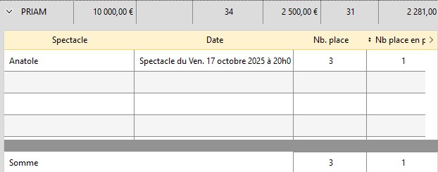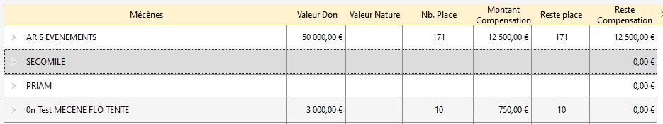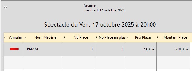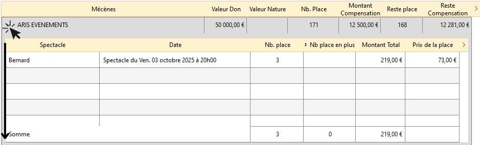 Exemple : sur la capture ci-dessus, le mécène "ARIS EVENEMENTS" a fait un don sur la saison de 50.000 euros. Ils ont droit à 171 places de spectacle sur la saison. 3 places ont été réservées sur le spectacle "Bernard" pour ce mécène, spectacle qui se déroulera le vendredi 3 octobre 2025 à 20h. Suivant le prix d'une place paramétré dans les options, le montant total du coût de ces 3 places est de 73 euros, ce qui fait un montant total de 3 x 73 = 219 euros.