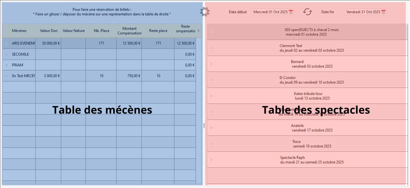 L'outil "Réservations Mécènes" a pour but de réserver les places de spectacle perçues par un Mécène, suivant la valeur du don que ce dernier a effectué durant une saison particulière.