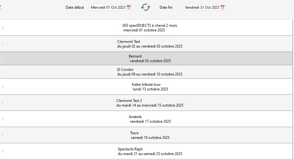Si vous cliquez sur la petite flèche sur la gauche de la ligne de spectacle, vous pourrez voir le détail des dates et heures de spectacles liées au spectacle en question.