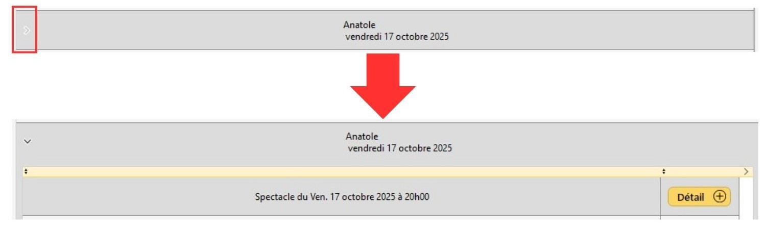 1/ Dans la table des spectacles, cliquez sur la flèche à la gauche du spectacle pour afficher le détail du spectacle.