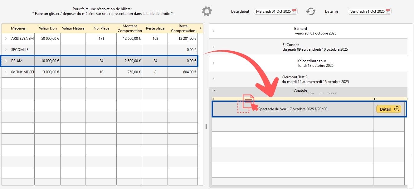 4/ Faites un "glisser-déposer" du mécène sur le spectacle pour réserver les places du mécène sur le spectacle en question.