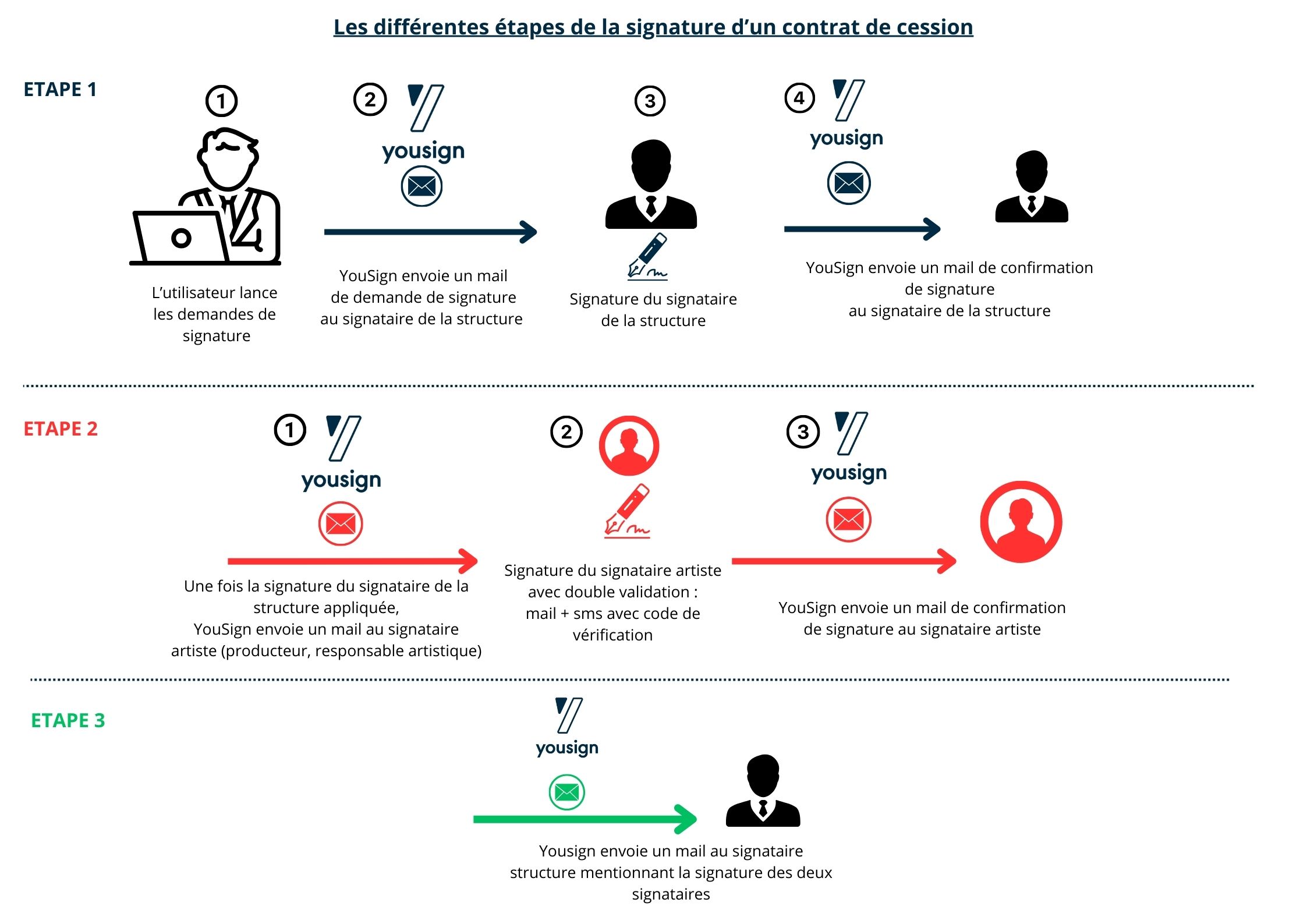 Le signataire de la structure recevra autant d'emails d'alerte de "Yousign pour RégieSpectacle" que de contrats qu'il aura à signer. Dans la procédure, il recevra 3 mails par contrat :