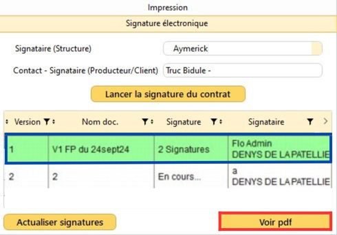 2/ Sélectionnez le contrat de cession dans la table (il est affiché en vert) et cliquez sur le bouton "Voir pdf"
