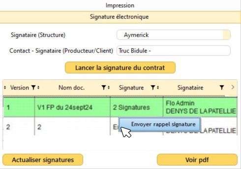 2/ Faites un clic droit sur un contrat en cours de signature, et cliquez sur "Envoyer rappel signature"