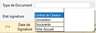 Pour filtrer la table et ne voir que les contrats de cession, sélectionnez "Contrat de cession" dans le volet déroulant "Type de document" au dessus de la table.