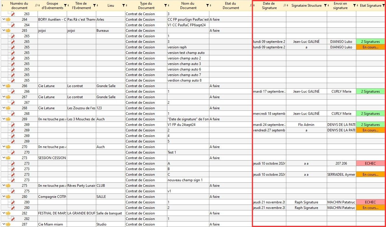 4 colonnes spécifiques aux signatures électroniques des contrats de cession sont présentes dans cette table. Elles vous permettent de voir :