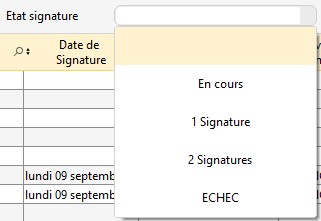Au dessus de la table, un volet déroulant "État signature" vous permet de filtrer les contrats de cession suivant l'état de la signature.