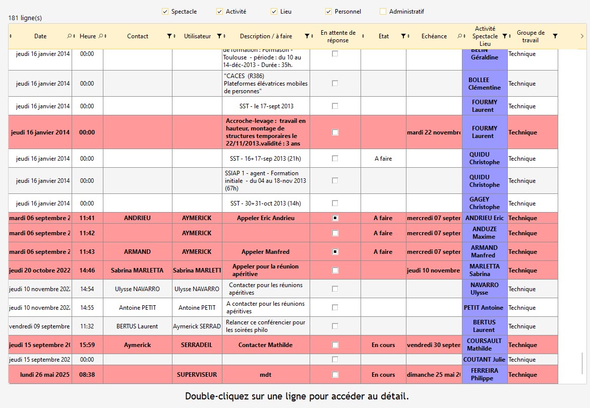 dans la nouvelle barre d'outils) permet d'afficher dans une même table les lignes de suivi des évènements, des activités, des lieux ou du personnel. Son fonctionnement est identique aux différents suivis.