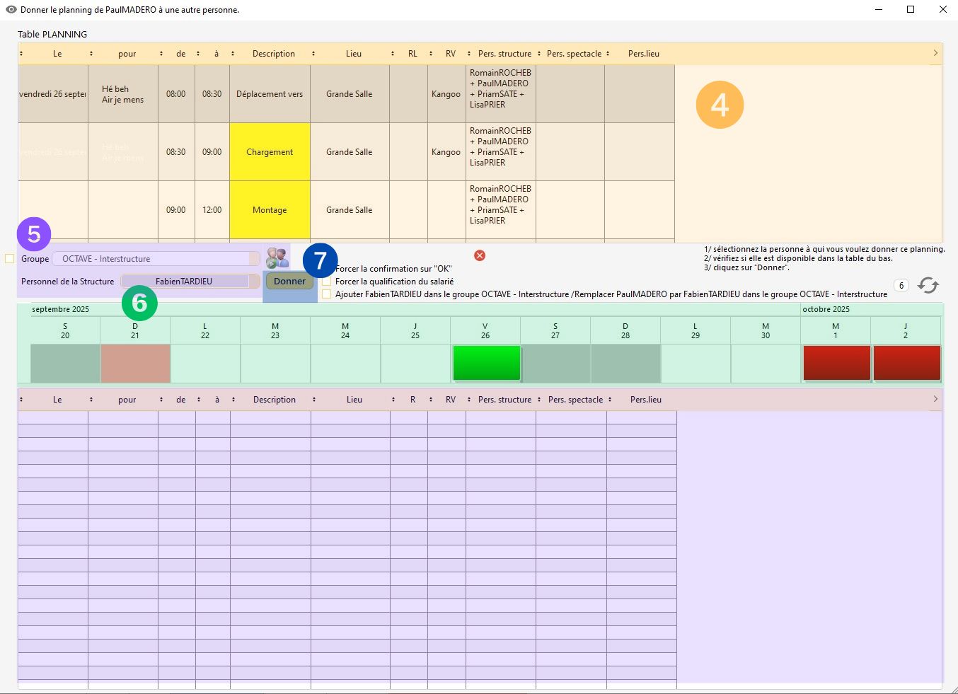 7/ Donnez le planning en cliquant sur le bouton "Donner" (bouton 7 sur l'image au-dessus).
