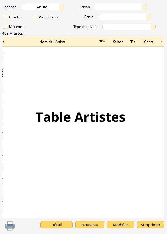 (sous la table "Artiste") pour imprimer la liste des Artistes et de leurs spectacles, ainsi que diverses informations.