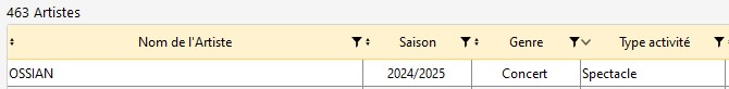 Il est possible de filtrer une partie de cette liste d'artistes par "Artiste", "Saison", "Genre" ou encore "Type activité".