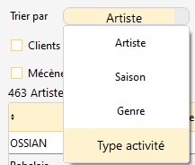 Un Type d'activité peut être affecté à un artiste (dans l'onglet Général en mode création ou modification de sa fiche).