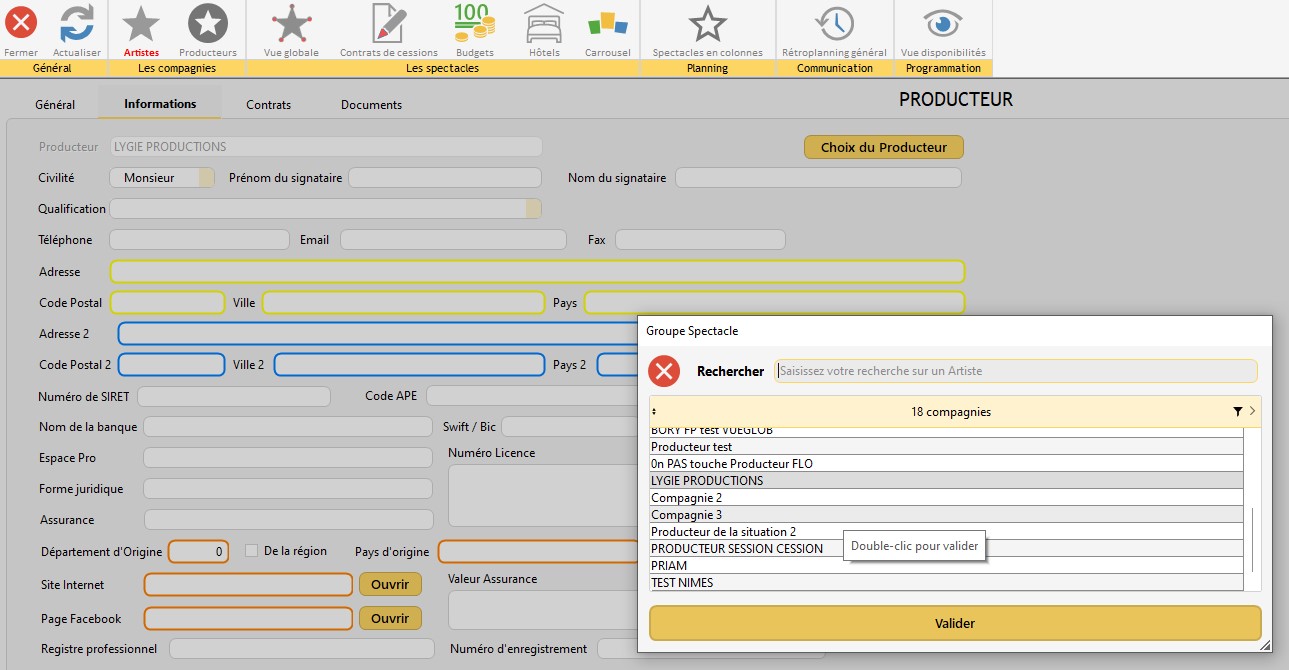 4/ lier le groupe d'évènement / compagnie avec un producteur (déjà enregistrée dans la base de données Artistes).