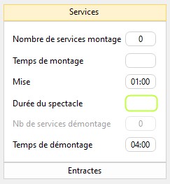 1/ Allez dans l'onglet "Technique", sous-onglet "Principal" du détail de la Fiche Spectacle, enregistrez les nombres de montage, durées de mise, spectacle et démontage.