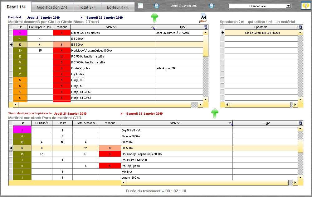 Lors de la saisie des « marques » dans le « planning », RS compare le matériel demandé par le « spectacle », avec le matériel du « lieu » dans lequel joue ce « spectacle ».