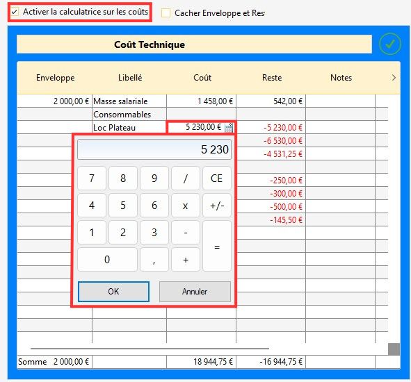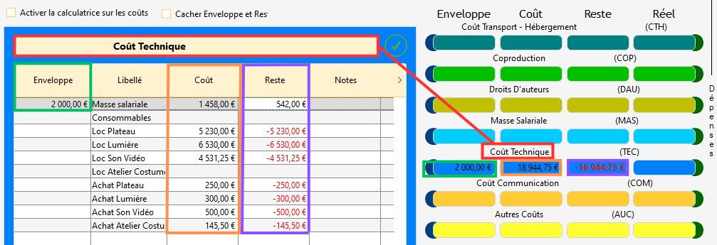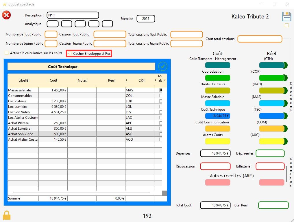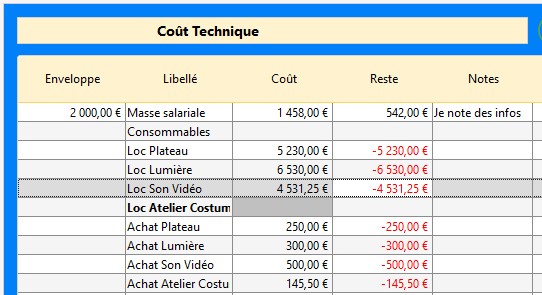 Info : dans le budget d'un spectacle, vous avez la possibilité de verrouiller une case sans qu'il y ait dans cette case (dans ce cas, la valeur est de zéro). Si vous verrouillez une case sans qu'il y ait une valeur indiquée dessus, elle se colorera en gris.