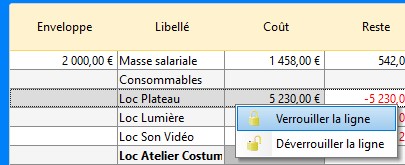 Chaque sous-rubrique peut être verrouillée indépendamment des autres.Toute la ligne sera verrouillée : l'enveloppe, le coût et le reste.