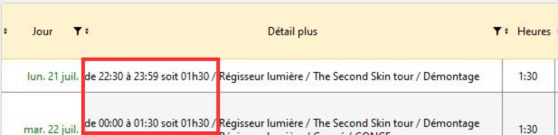 Comme dans l’éditeur de planning classique (onglet Éditeur de Planning, Planning Graphique, Calendrier annuel), les heures à cheval sur 2 jours sont gérées par RS dans la validation des heures du personnel ("Valider par jour" dans Planning Annuel de la personne).