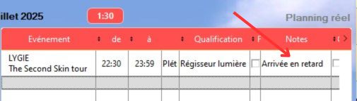 La colonne "Notes" dans le planning réel fonctionne comme la colonne "Mémo" de l'éditeur des plannings.