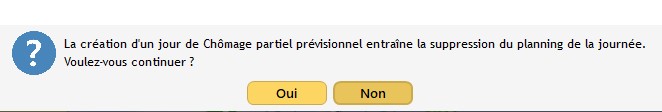 crée une période de chômage partiel prévisionnelle (Toute la journée / Le matin / L’après-midi). Si des lignes prévisionnelles existaient déjà, une fenêtre d'alerte vous prévient que le planning prévisionnel de la journée sera supprimé.