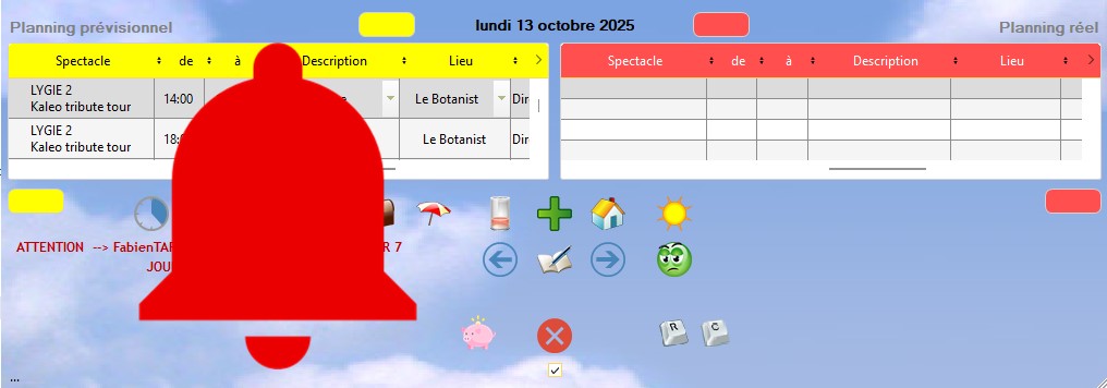 Quand vous ouvrez la fenêtre de validation des heures, il se peut qu'en bas à gauche de la fenêtre une cloche rouge s'affiche : il s'agit d'une alerte pour vous prévenir d'une alarme liée aux conditions d'affectation du personnel sur les lignes de planning : un temps de travail consécutif conséquent par exemple pour le personnel sur la journée en question, ou la semaine concernée par le planning.