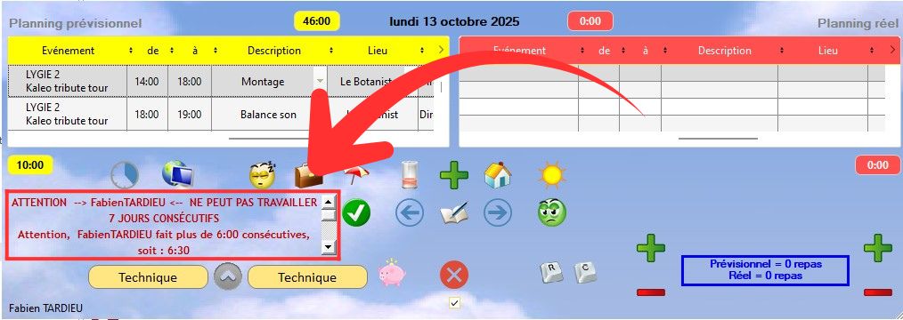 Ce système d'alarme s'affiche aussi si vous créez du planning prévisionnel via cette fenêtre, et vous alerte suivant les conditions d'affectation du personnel.