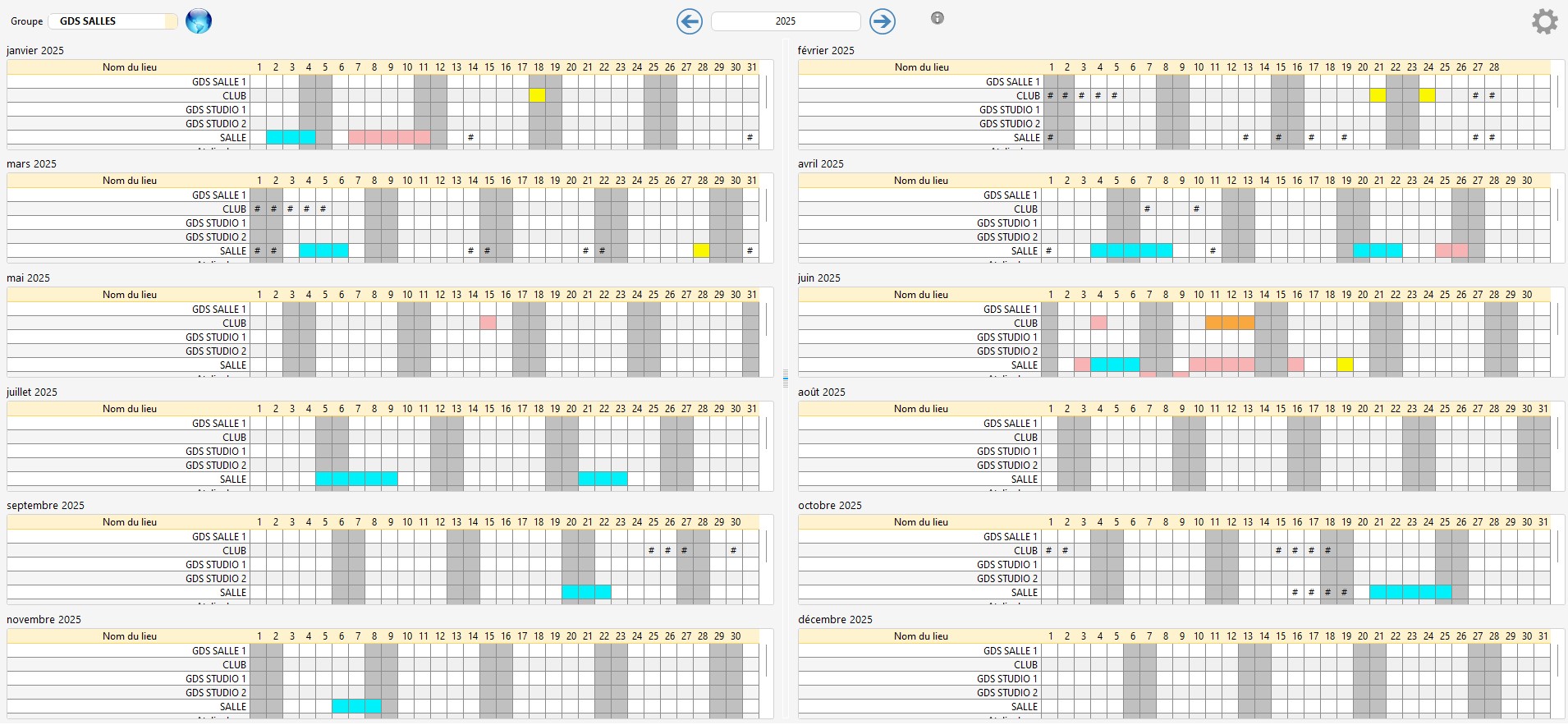 Dans la Vue Annuelle des Lieux par Type d'Activité, les weekends sont de couleur gris foncé.